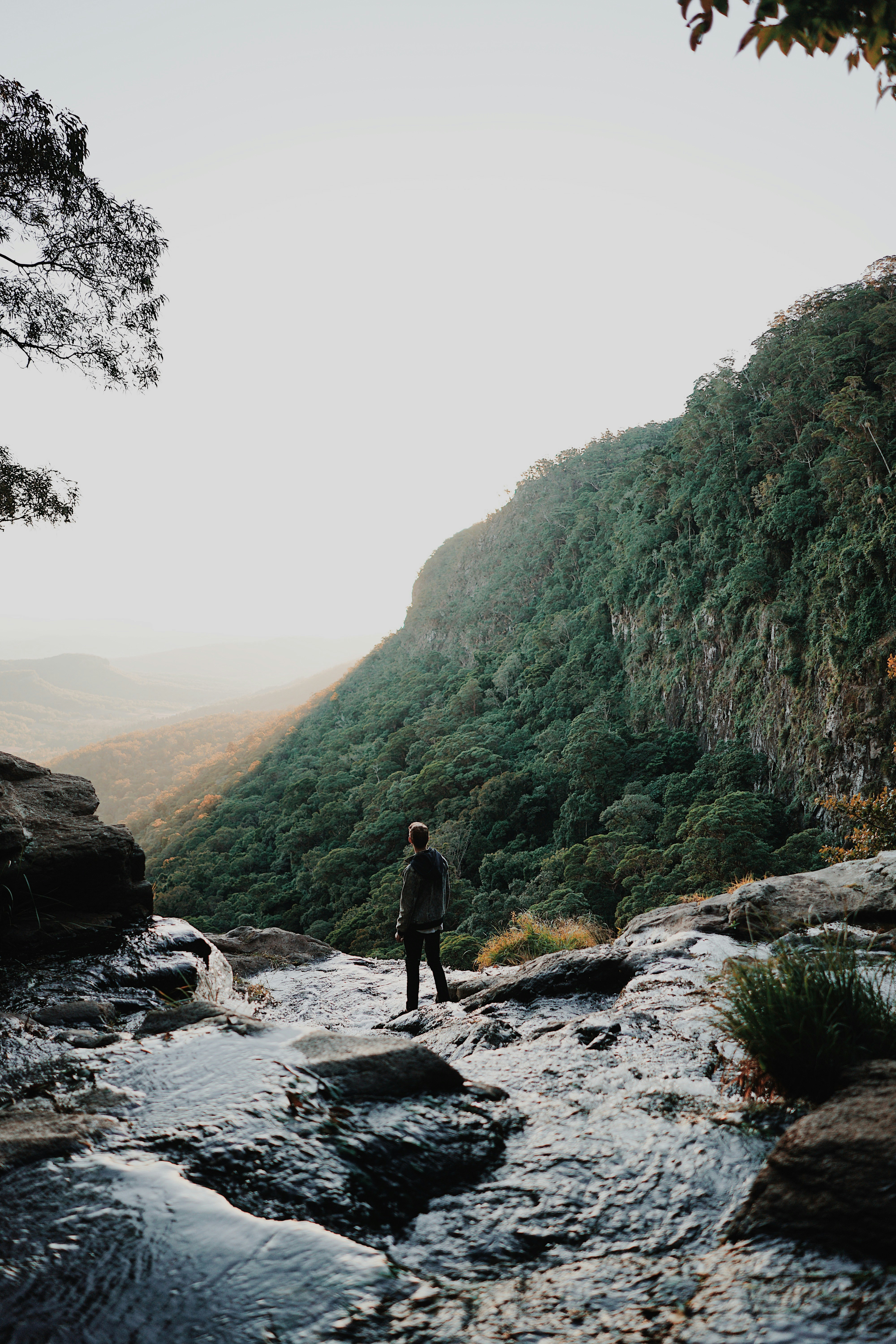 man standing on waterfall cliff overlooking side of mountain with green | 1080 x 1620 px